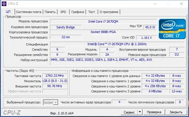 - Информация о кэш-памяти, поддерживаемых инструкциях и разъеме