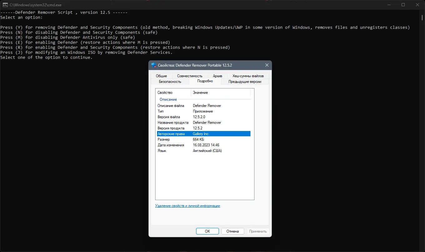 Defender Remover — это легкая и портативная утилита, разработанная для быстрого отключения встроенного антивируса и защитных служб Windows. Она обеспечивает удобный интерфейс, напоминающий консольный инструмент, где достаточно выбрать нужный вариант отключения и перезагрузить систему для применения изменений. В отличие от стандартных методов, эта программа удаляет не только Защитник Windows, но и связанные компоненты, такие как Windows SmartScreen, службы веб-угроз, виртуализацию файлов (UAC), Microsoft Defender App Guard и другие элементы защиты. Такой подход позволяет полностью отключить защиту, что бывает необходимо при использовании сторонних антивирусных решений или для проведения определенных системных настроек, связанных с тестированием и разработкой.