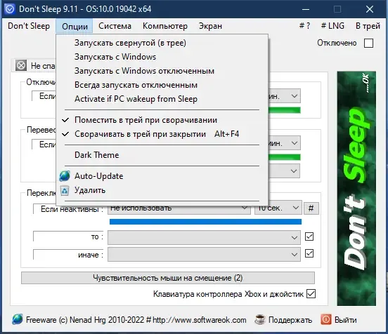 Dont Sleep — это компактная портативная утилита, которая помогает управлять настройками электропитания и блокировками системы. Основное её преимущество — возможность быстро отключать или включать функции, связанные с энергосбережением, без необходимости заходить в сложные настройки Windows. Программа особенно полезна для пользователей, использующих устаревшее программное обеспечение или работающих в условиях, требующих постоянного контроля над режимами питания и безопасности системы.