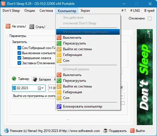Dont Sleep — это портативное решение для управления настройками электропитания, которое позволяет временно отключить функции, такие как гибернация, блокировка экрана или отключение монитора. Программа отлично подходит для пользователей, использующих устаревшее программное обеспечение, требующее постоянного активного режима работы без перерывов. Благодаря встроенному планировщику, можно заранее настроить выполнение определенных действий с питанием системы в заданное время, что делает управление более автоматизированным и удобным.