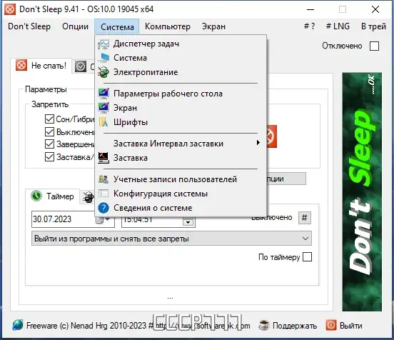 Don’t Sleep представляет собой легкий и портативный инструмент, предназначенный для временного отключения системных настроек электропитания. Он позволяет выбрать конкретные параметры, которые нужно отключить, и установить таймер, после которого программа автоматически выполнит заданные действия — выключение, блокировку или перевод в режим сна. Это особенно полезно для тех, кто использует устаревшее программное обеспечение или сталкивается с конфликтами современных системных функций. Программа полностью автономна и работает без установки, что делает ее удобной для использования на различных устройствах и носителях.