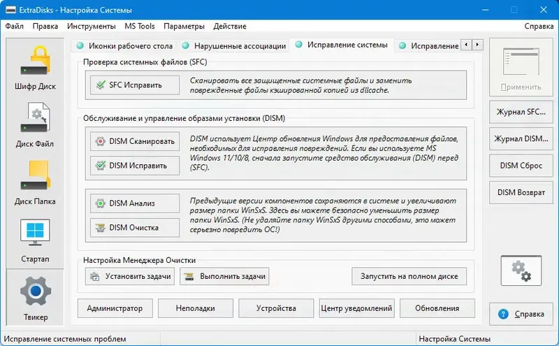 ExtraDisks — это универсальный набор системных утилит для создания виртуальных дисков и повышения безопасности данных на компьютере. Программа позволяет быстро и удобно управлять зашифрованными, виртуальными дисками, а также настраивать параметры системы для оптимальной работы и защиты информации. Она подойдет как для опытных пользователей, так и для тех, кто ищет простое решение для организации виртуальных хранилищ без необходимости разбиения физических дисков.