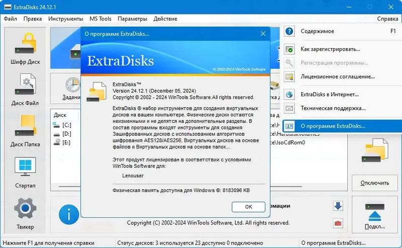 ExtraDisks — это универсальное решение для создания виртуальных дисков и обеспечения безопасности данных. В программе реализованы инструменты для шифрования информации с использованием современных алгоритмов AES128 и AES256, что делает создание зашифрованных дисков надежным способом защиты. Также она позволяет быстро монтировать виртуальные диски из файлов и папок, что значительно упрощает управление данными и повышает эффективность работы с ними.