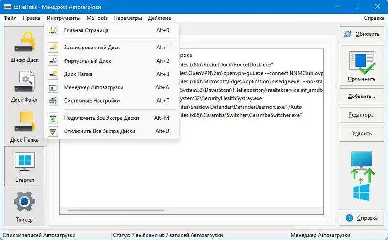 - Управление автозагрузкой приложений и системных компонентов