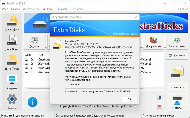ExtraDisks — это универсальный набор системных утилит, предназначенных для создания и управления виртуальными дисками на вашем компьютере. Программа позволяет создавать зашифрованные, виртуальные диски на основе файлов и каталогов, а также управлять автозагрузкой и системными настройками. Благодаря этим инструментам обеспечивается повышенная безопасность данных и удобство работы с виртуальными хранилищами информации.