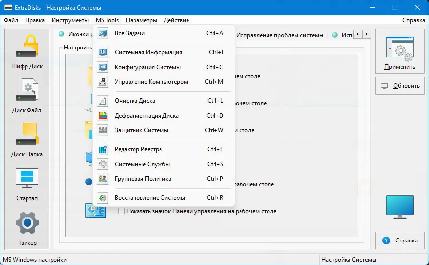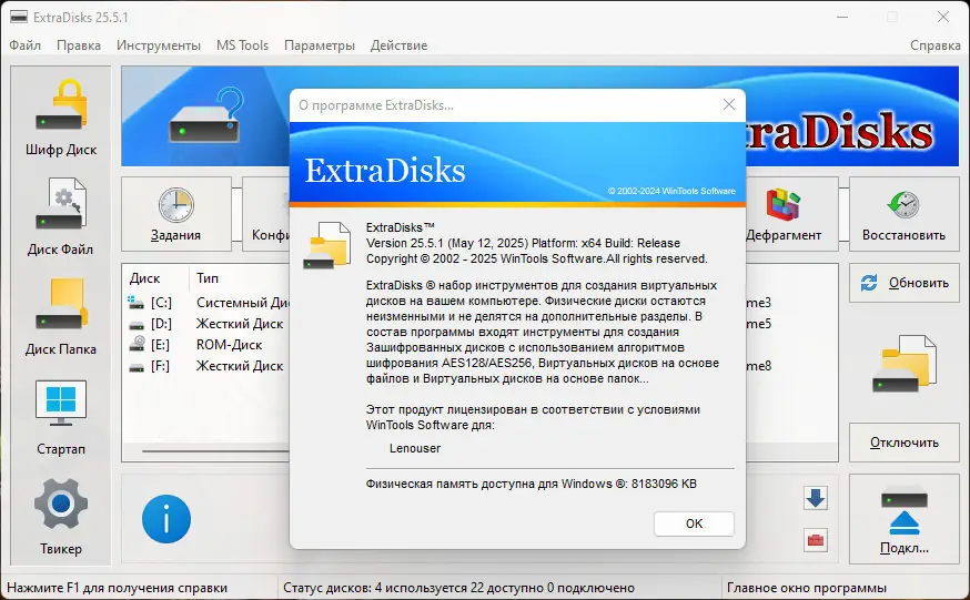ExtraDisks представляет собой мощный набор системных утилит, предназначенных для создания виртуальных дисков и обеспечения их защиты. Он включает инструменты для шифрования данных с использованием современных алгоритмов AES128 и AES256, а также для быстрого доступа к часто используемым папкам и файлам. Благодаря этим функциям программа подходит для пользователей, которым важна безопасность информации и эффективность работы с виртуальными хранилищами.