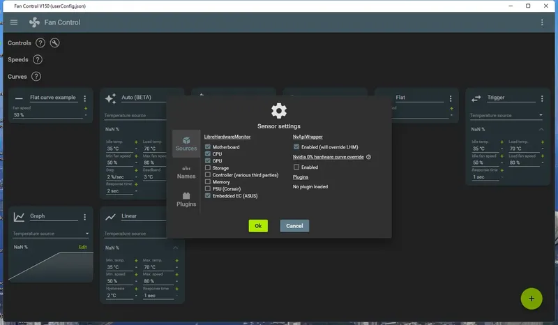 FanControl — это универсальный инструмент для настройки вентиляторов, который не требует установки и полностью портативен. Он поддерживает работу с датчиками температуры и скорости вращения, обеспечивая точный контроль над охлаждением системы. Простым и современным интерфейсом программа делает управление кулерами интуитивно понятным, а наличие мастера настройки помогает быстро определить все доступные датчики и задать оптимальные параметры.