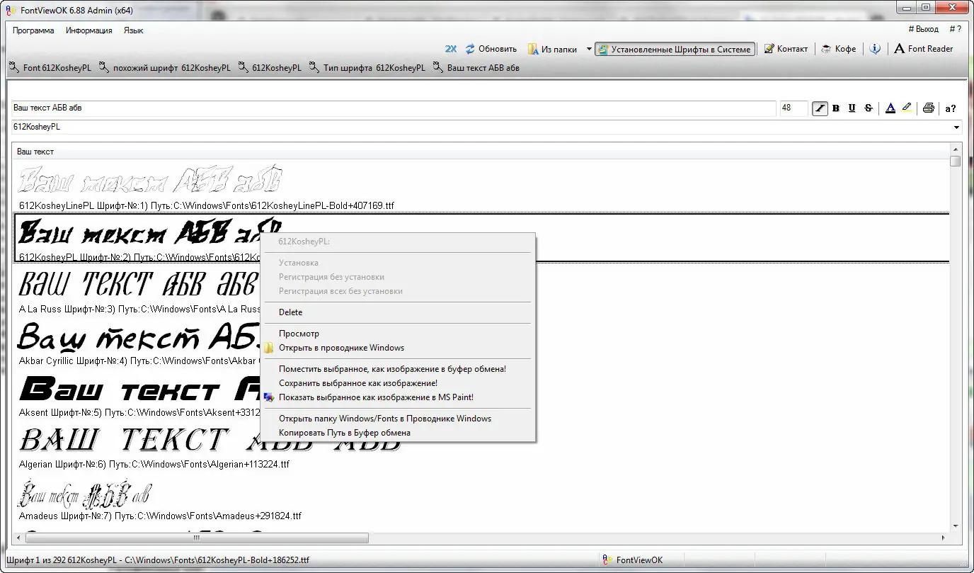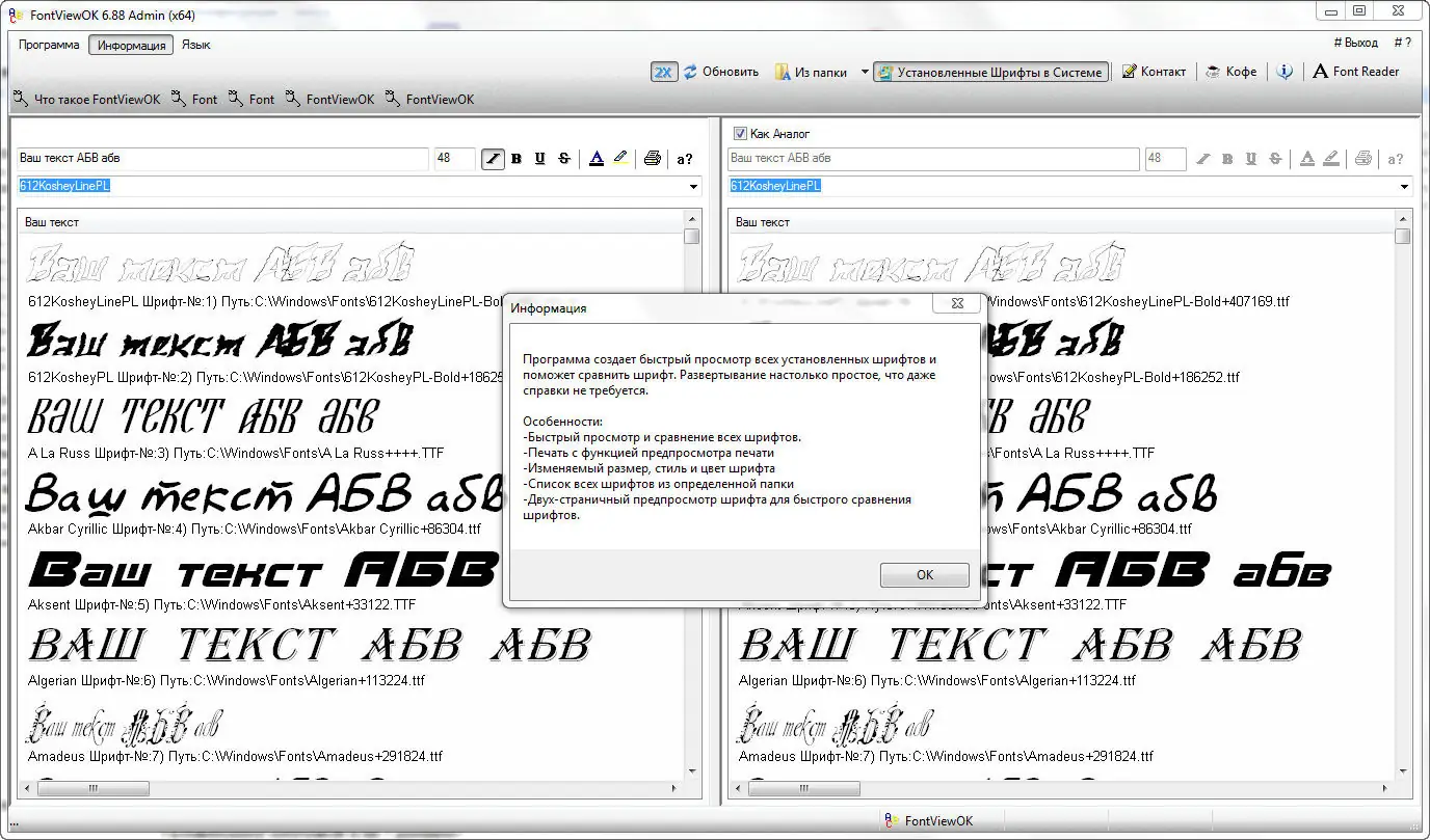 FontViewOK — это компактная и функциональная программа, которая после запуска отображает все установленные в системе шрифты. Ее основное преимущество — возможность сразу вводить любой текст в специальное поле и видеть, как он выглядит в выбранном стиле. Кроме того, программа позволяет изменять цвет, размер и стиль шрифта, что значительно упрощает подбор оптимальных вариантов для различных проектов. Удобство использования и минимализм делают её незаменимым инструментом для работы с типографикой и дизайном.