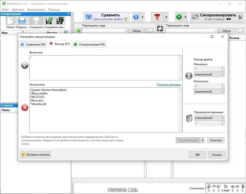 - Возможность использования фильтров для включения или исключения файлов и папок