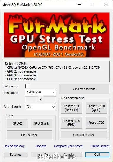 FurMark — это популярная утилита для проведения 3d стресс тестов видеокарт, которая помогает определить их надежность и устойчивость при экстремальных нагрузках. Встроенные функции позволяют запускать как стандартные тесты, так и режимы принудительного отказа (burn-in), что особенно полезно для оверклокеров и тех, кто занимается разгонной настройкой графических карт. Кроме того, программа поддерживает фиксацию результатов, которые можно загрузить на официальный сайт разработчика для сравнения и анализа. В комплект входит интеграция с утилитами GPU-Z и GPU Shark, что расширяет возможности мониторинга и диагностики видеокарт.