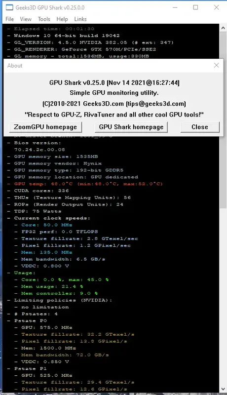 GPU Shark представляет собой небольшое, но очень удобное приложение, основанное на платформе ZoomGPU. Оно предназначено для быстрого и точного мониторинга видеокарт, а также обеспечивает отображение критически важных данных в реальном времени. Благодаря простому интерфейсу и наличию двух режимов просмотра, программа легко адаптируется под нужды пользователя, позволяя получать как основные показатели, так и расширенную информацию о работе видеокарты. GPU Shark отлично подходит для тестирования и диагностики, а также для анализа в таких программах, как Furmark, что помогает понять эффективность охлаждения и стабильность системы.