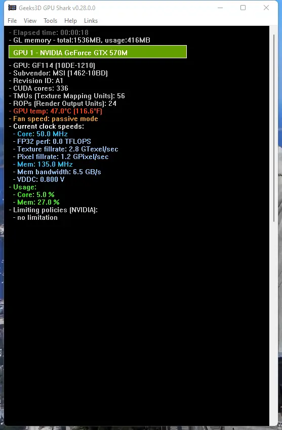 GPU Shark — это небольшая бесплатная утилита для мониторинга работы видеокарт на базе чипов NVIDIA GeForce и ATI Radeon. Простая в использовании, она позволяет отслеживать важные параметры видеокарты в реальном времени, такие как тактовые частоты, температура, скорость вентилятора и использование ресурсов. Программа подходит как для профессиональных специалистов, так и для любителей, желающих контролировать состояние своего GPU во время интенсивных нагрузок или игр.