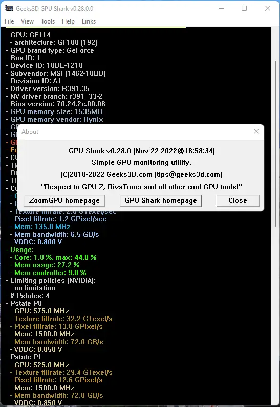 GPU Shark — это компактная и удобная утилита, которая основана на ZoomGPU и предназначена для быстрого и точного мониторинга графических процессоров. Она поддерживает широкий спектр видеокарт, включая последние модели GeForce RTX 4090 и RTX 4080, а также новые драйверы и BIOS. В программе реализованы два режима отображения информации: упрощенный, показывающий основные параметры, и подробный, включающий расширенные технические данные. Также есть возможность отдельного просмотра памяти и настройки отображения по индивидуальным предпочтениям.