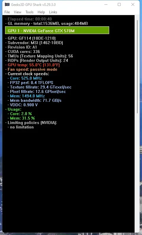 GPU Shark — это легкая и бесплатная утилита для мониторинга состояния видеокарт на базе чипсетов NVIDIA GeForce и ATI Radeon. Она позволяет пользователям быстро получать актуальную информацию о работе GPU, включая тактовые частоты, температуру, использование ресурсов и состояние вентиляторов. Благодаря простому интерфейсу и возможностям отображения данных в двух режимах, эта программа отлично подходит для тех, кто хочет контролировать нагрузку и параметры видеокарты в режиме реального времени.
