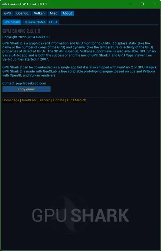 GPU Shark 2 — это современная системная утилита для тестирования и мониторинга видеокарт. Она предназначена для отображения ключевых параметров работы графического процессора и VRAM, а также для получения информации о поддержке API OpenGL и Vulkan. Благодаря простому интерфейсу и расширенным возможностям, программа становится незаменимым инструментом для энтузиастов и специалистов, занимающихся диагностикой и оптимизацией видеокарт.