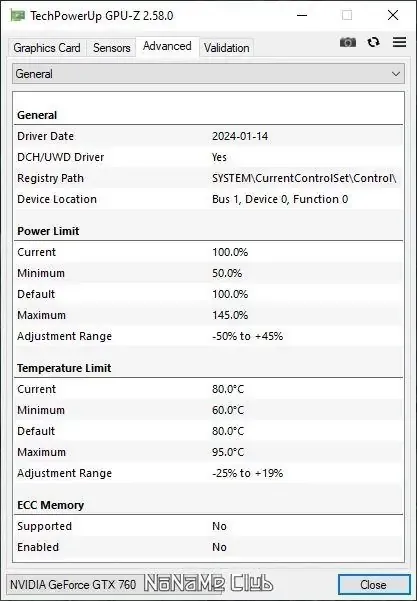- Отображение информации о видеопамяти, шине и драйверах.