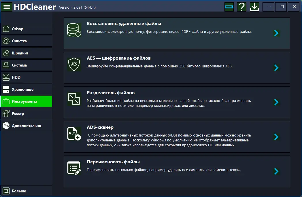 HDCleaner — это универсальный инструмент для системной оптимизации, созданный немецким разработчиком Kurt Zimmermann. Он включает в себя множество функций, таких как очистка жесткого диска, реестра, удаление следов использования и управление автозагрузкой. Программа оптимизирована для работы с SSD и HDD, что позволяет ускорить работу компьютера и повысить его стабильность. Основная идея HDCleaner — предоставить пользователю надежный набор средств для быстрого и безопасного обслуживания системы без необходимости обращения к специалистам.