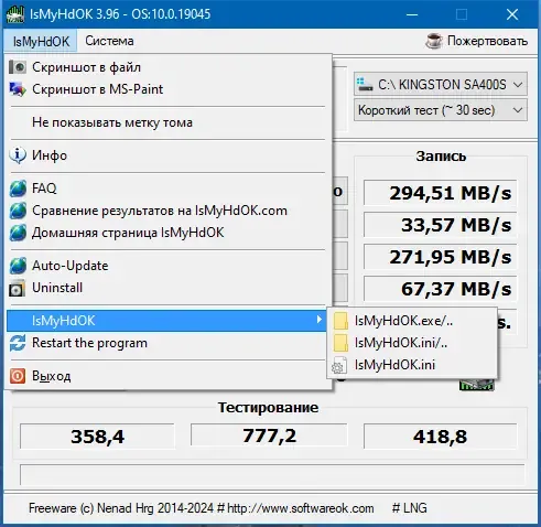 IsMyHdOK представляет собой легкую утилиту, предназначенную для оценки скорости и надежности жестких дисков, SSD и USB-носителей. Ее основные преимущества — простота использования и широкий функционал, позволяющий выполнять тесты разной продолжительности. Программа отлично подходит для диагностики и профилактики, а также позволяет оперативно выявить возможные проблемы с накопителями.