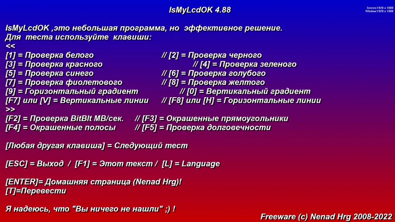 IsMyLcdOK — это небольшая, но очень эффективная программа для тестирования LCD-мониторов на наличие битых или поврежденных пикселей. Она демонстрирует различные цветовые заливки, что позволяет обнаружить даже самые скрытые дефекты. Благодаря тому, что программа не требует установки и может запускаться с переносных устройств, ее легко использовать в любых условиях. Это делает ее одним из лучших инструментов для проверки качества дисплеев и диагностики неисправностей.