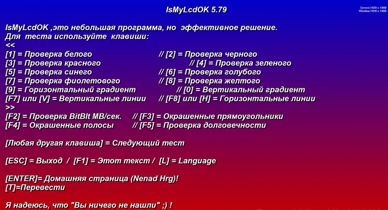 IsMyLcdOK — это бесплатная и портативная утилита, предназначенная для быстрого обнаружения битых или поврежденных пикселей на LCD мониторах. Программа не требует установки и подходит для использования на различных устройствах, что делает её удобным инструментом для системных администраторов и обычных пользователей. Простота в использовании и интуитивный интерфейс позволяют легко проверить состояние дисплея и своевременно выявить возможные дефекты.