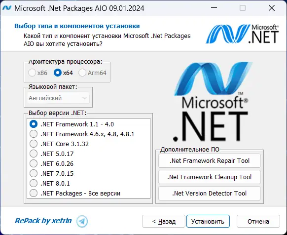 Microsoft .Net Packages AIO представляет собой универсальный комплект для автоматической установки различных версий .NET Framework и связанных инструментов. Он включает в себя все основные релизы, начиная с версии 1.1 и до последних обновлений 4.8 и 4.8.1, а также версии .NET Core и .NET 5/6/7/8. Это позволяет обеспечить совместимость с большим количеством программных решений, повысить производительность системы и упростить процесс обновления. Программа включает дополнительные утилиты, такие как Repair Tool и Cleanup Tool, что делает её незаменимой при устранении проблем с установкой и удалением компонентов.