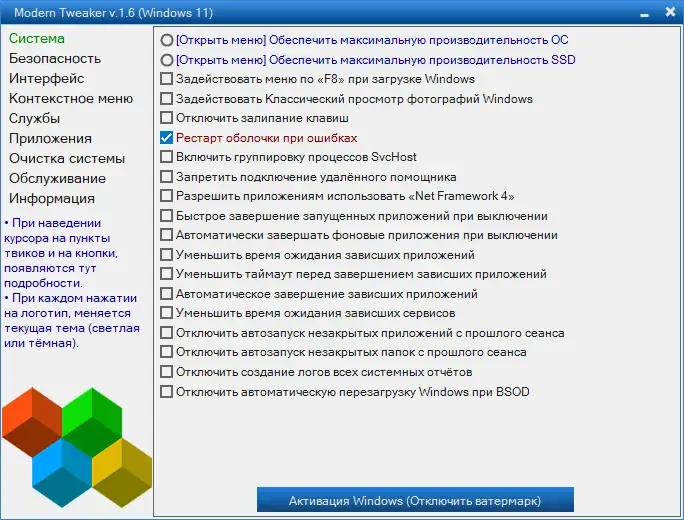 Для использования Modern Tweaker достаточно скачать программу с официального сайта и запустить ее. После запуска интерфейс разделен на вкладки, каждая из которых содержит конкретные настройки — от изменения внешнего вида до управления службами Windows. Пользователь может выбрать нужные параметры, произвести настройку и сохранить изменения. В случае необходимости можно воспользоваться функцией отката, чтобы вернуть систему к исходным значениям. Программа также позволяет активировать и настраивать Windows 10, что делает ее универсальным инструментом для оптимизации различных версий операционной системы.