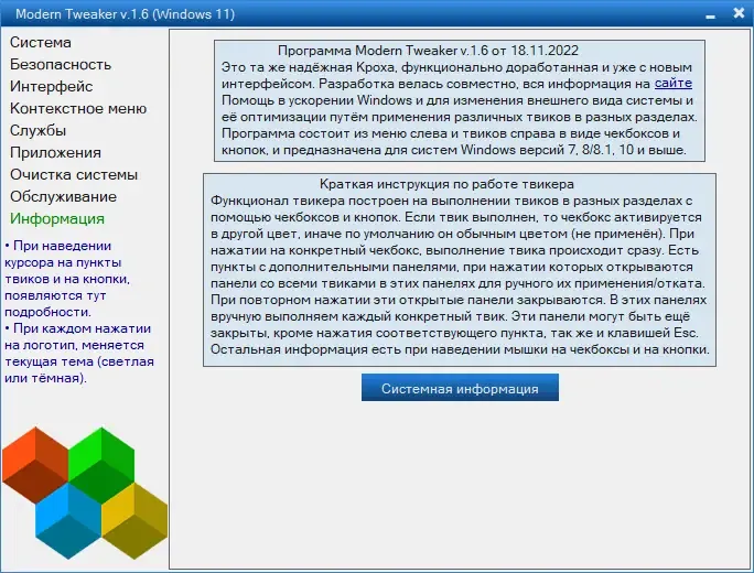 Modern Tweaker — это универсальная программная оболочка для твиков Windows, которая позволяет даже неопытным пользователям легко и быстро повысить производительность системы. Благодаря простому интерфейсу и множеству настроек, программа помогает оптимизировать работу операционной системы, улучшить безопасность и внешний вид Windows без необходимости глубоких знаний в области IT.