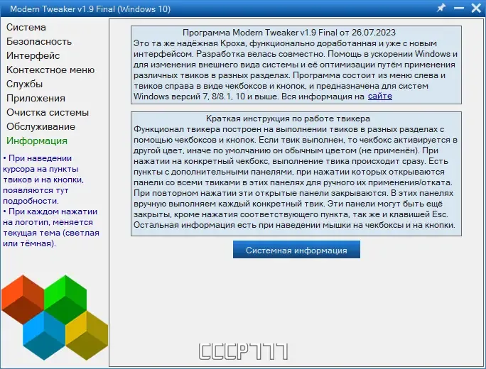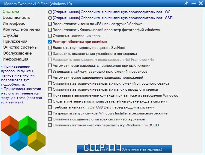 Modern Tweaker — это мощная системная утилита для оптимизации работы Windows, которая позволяет пользователям без специальных знаний настраивать и ускорять свою операционную систему. Программа предоставляет удобный интерфейс для проведения различных твиков, улучшая производительность и безопасность ПК.