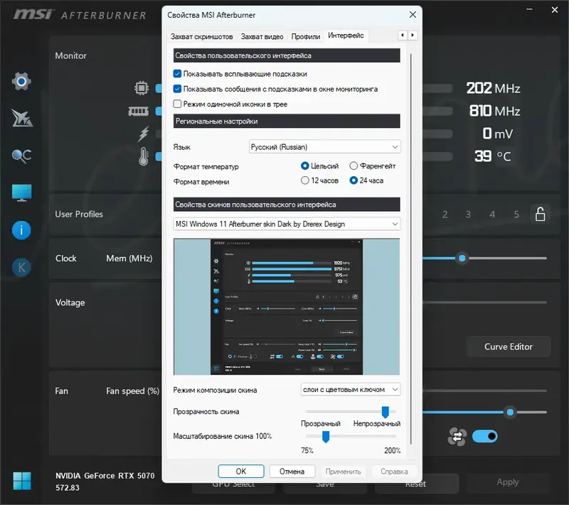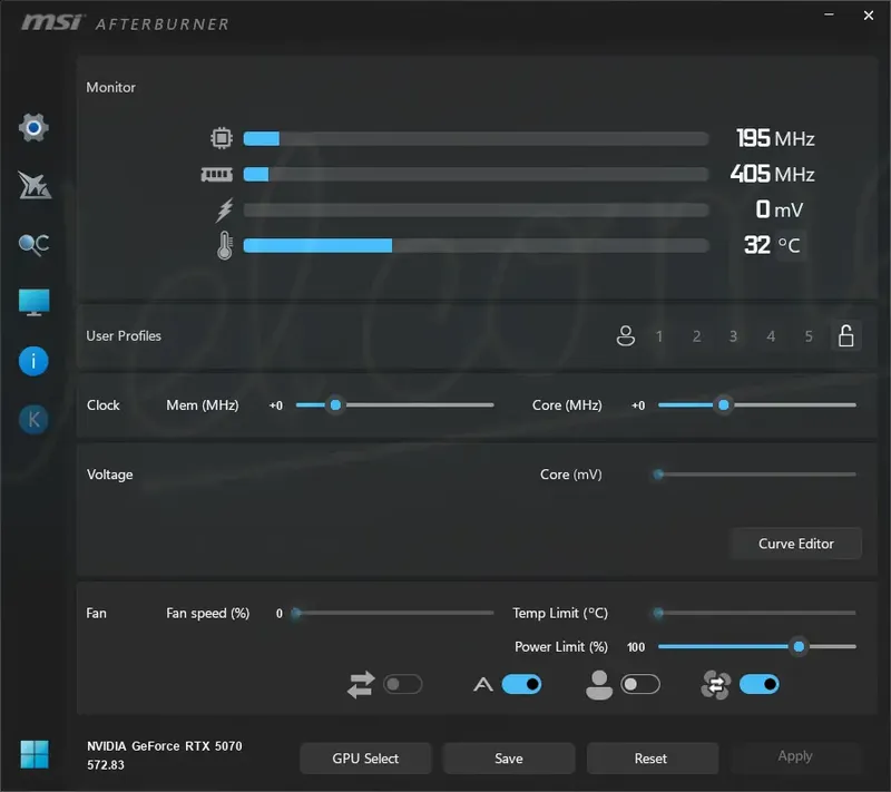 MSI Afterburner — это мощная системная утилита, предназначенная для тестирования и разгона видеокарт различных производителей. С её помощью можно изменять частоты GPU, Shader и памяти, а также управлять скоростью вращения кулеров и регулировать напряжения. Программа поддерживает все операционные системы семейства Windows (архитектуры x86 и x64), предоставляя полный контроль над настройками видеокарты и возможностью мониторинга в реальном времени. Важной особенностью является поддержка профилей и горячих клавиш, что делает работу с программой максимально удобной и быстрой.