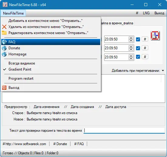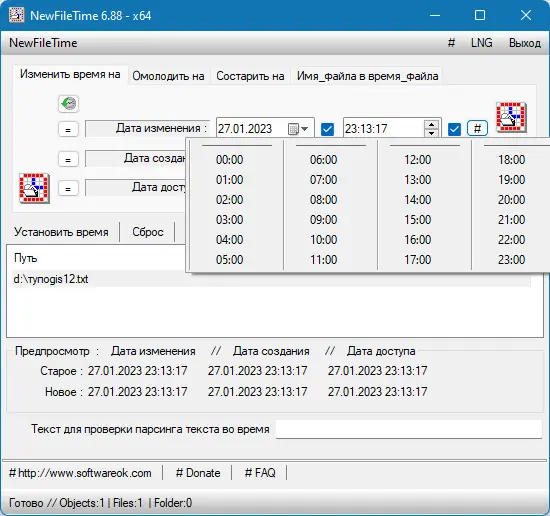 NewFileTime — это небольшая портативная утилита, предназначенная для легкого изменения даты и времени создания файлов и папок на компьютере. Она не требует установки и идеально подходит для быстрого редактирования метаданных файлов без сложных настроек. Программа обладает простым интерфейсом, что делает ее удобной даже для новичков, а возможность скачать ее на русском языке делает использование максимально комфортным.