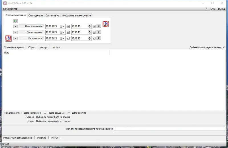 Для работы с программой достаточно запустить портативный файл, добавить нужные файлы или директории, после чего выбрать желаемую дату и время. В интерфейсе легко указать параметры изменения, а затем сохранить результат. Весь процесс занимает всего несколько минут и не требует дополнительных настроек или сложных действий.