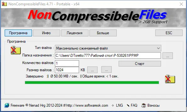 NonCompressibleFiles — это легкая и удобная утилита, которая помогает создавать файлы с заданными характеристиками без необходимости установки. Ее функциональность включает генерацию как максимально сжимаемых, так и полностью несжимаемых файлов, что важно при проведении тестов и оценке эффективности архиваторов, систем хранения данных и скорости передачи информации. Программа особенно ценна для специалистов в области информационных технологий, тестировщиков и разработчиков программного обеспечения, которым необходимы надежные и быстрые способы получения тестовых данных. Встроенные настройки позволяют легко управлять размером создаваемых файлов и количеством генерируемых объектов, что делает утилиту универсальной и удобной в использовании.