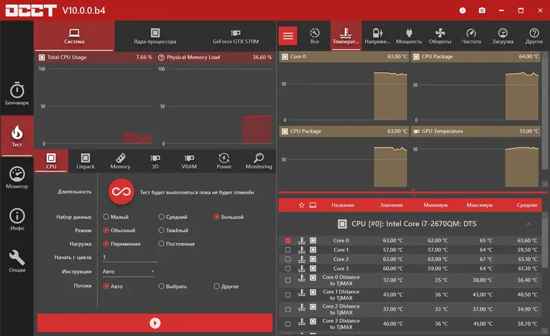 Для проведения теста необходимо загрузить и установить программу с официального сайта. После запуска пользователь выбирает тип теста: стресс-тест процессора, памяти или видеокарты, а также задает параметры нагрузки и времени выполнения. В процессе тестирования программа отображает текущие параметры системы и графики, показывающие температуру, напряжение и другие важные показатели. По завершении теста можно просмотреть подробный отчет и принять решение о необходимости дальнейших действий или дополнительных проверок. Скачать OCCT можно на странице официального сайта, что гарантирует безопасность и актуальность версии программы.