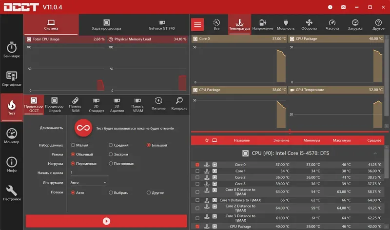 Для проведения теста в OCCT необходимо выбрать нужные параметры в интерфейсе программы, такие как тип теста, его сложность и продолжительность. После настройки запускается процесс тестирования, который отображает текущие параметры системы и прогресс проверки в реальном времени. В ходе теста программа выводит графики температуры, загрузки и других характеристик компонентов, что позволяет контролировать их состояние. По завершении теста пользователь получает подробный отчет с результатами и рекомендациями для дальнейших действий. Скачать программу можно на официальном сайте, где доступна также портативная версия для быстрого запуска без инсталляции.