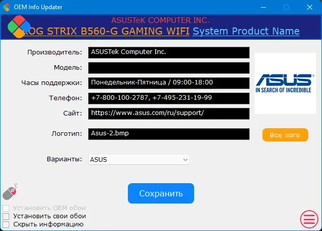 OEM Info Updater — это универсальный инструмент, который позволяет пользователям персонализировать и обновлять OEM данные своего устройства. Программа подходит как для домашних пользователей, так и для специалистов по техническому обслуживанию, которые хотят быстро настроить параметры системы под требования клиента. Она обеспечивает доступ к большому набору готовых шаблонов, а также позволяет добавлять собственные логотипы и контактную информацию. Возможность выбора страны и языка интерфейса делает использование программы максимально удобным для разных регионов. Встроенные функции позволяют сохранять и восстанавливать оригинальные данные, что повышает безопасность и гибкость работы.