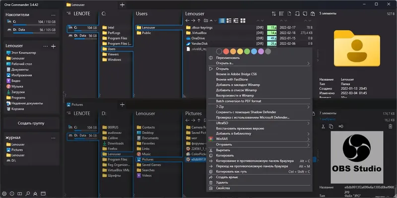 One Commander V3 — это современный и многофункциональный файловый менеджер для Windows, предоставляющий расширенные возможности навигации и организации данных. Он обладает интерфейсом с вкладками, двумя панелями и системой навигации по столбцам, что значительно ускоряет работу с вложенными каталогами. Встроенный предварительный просмотр файлов, настройка тем, цветовые теги и интеллектуальные функции помогают быстро находить нужные документы и управлять ими без усилий.