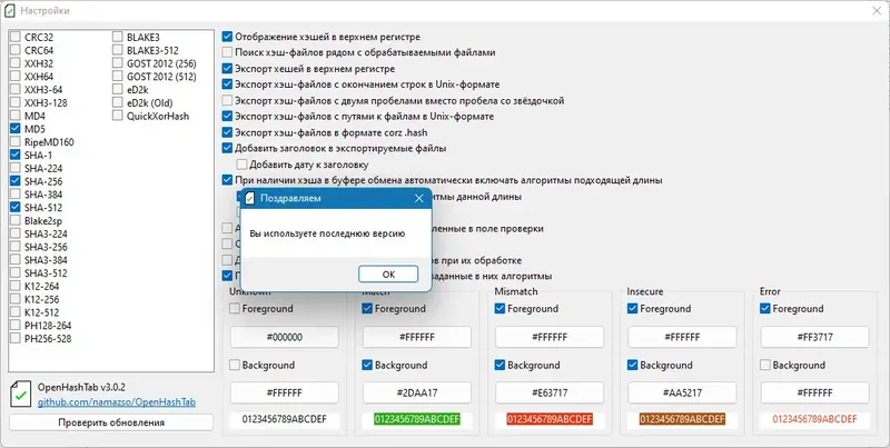 OpenHashTab представляет собой мощное решение для проверки хэш-сумм файлов, которое легко интегрируется в операционную систему Windows. Программа позволяет пользователю вычислять контрольные суммы с помощью 28 различных алгоритмов, включая MD5, SHA-2, SHA-3, Blake2, xxHash и другие, что обеспечивает гибкость и широкий выбор методов защиты данных. Ее интерфейс полностью соответствует стандартам Windows, поддерживает экраны с высоким DPI и работу с длинными путями, что делает использование максимально комфортным даже при работе с большими объемами данных.