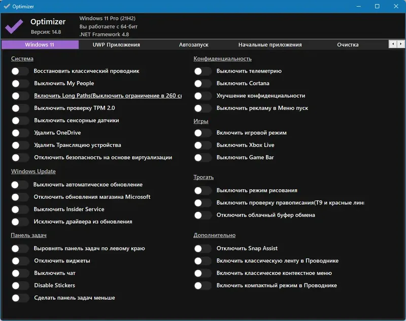 Optimizer — это мощная системная утилита для оптимизации работы Windows, которая поможет повысить безопасность, восстановить конфиденциальность и ускорить работу системы. Программа предназначена для использования после чистой установки Windows и позволяет выполнять расширенные настройки, связанные с управлением службами, обновлениями и сетевыми параметрами. Благодаря поддержке множества языков и простому интерфейсу, Optimizer подходит как для опытных пользователей, так и для новичков, желающих максимально улучшить работу своего ПК.
