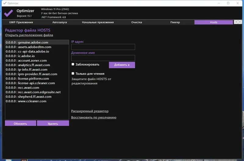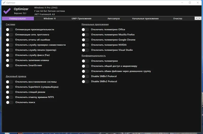 Optimizer — это универсальный инструмент для настройки системы Windows, предназначенный для повышения ее эффективности и защиты данных. Программа позволяет отключить ненужные службы, такие как телеметрия, Cortana, автоматические обновления, а также удалять лишние приложения UWP и очищать системный диск. Благодаря многоязычной поддержке и простому интерфейсу, она подойдет как новичкам, так и опытным пользователям. Optimizer особенно полезен после чистой установки Windows, когда важно настроить систему для максимальной конфиденциальности и безопасности.