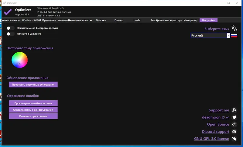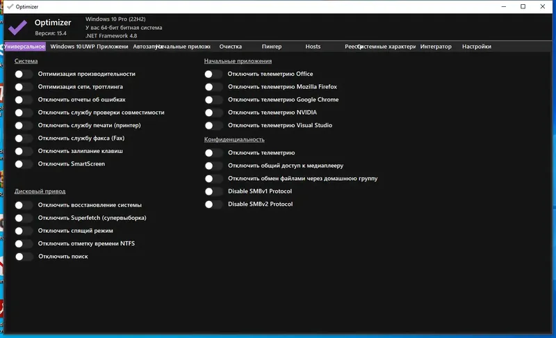 Optimizer — это универсальная утилита для настройки и оптимизации системных параметров Windows. Она предназначена для быстрого восстановления конфиденциальности, отключения ненужных функций и служб, а также для повышения скорости работы сети и системы в целом. Программа поддерживает многоязычный интерфейс, что делает её доступной для пользователей по всему миру. Благодаря встроенным инструментам, Optimizer помогает исправить распространённые проблемы с реестром, очистить системный диск и управлять настройками безопасности. Также в ней реализованы функции для быстрого скачивания приложений, удаления UWP-приложений, изменения DNS и редактирования файла HOSTS. Все эти возможности делают Optimizer незаменимым помощником для тех, кто ценит стабильность и безопасность своей системы.