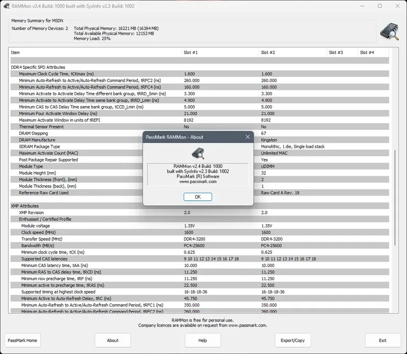 PassMark RAMMon — это мощная и простая в использовании утилита для тестирования и анализа оперативной памяти. Она отображает информацию о модулях SPD, что позволяет определить точные параметры памяти, включая рабочие тайминги, напряжения и температуру. Благодаря поддержке различных типов памяти, таких как DDR2, DDR3, DDR4, DDR5, XMP и EPP, программа подходит для широкого спектра систем и конфигураций.