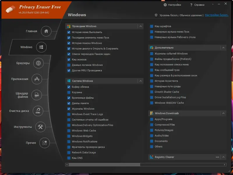 PrivaZer — это универсальный инструмент для глубокой очистки системы, который позволяет удалять следы работы браузеров, файловых менеджеров, системных журналов и других элементов, оставляющих следы на диске. Он обладает интуитивно понятным интерфейсом и быстрым сканированием, что делает его подходящим как для опытных пользователей, так и для новичков. Программа поддерживает работу с внутренними и внешними накопителями, включая USB-устройства и карты памяти, обеспечивая комплексную защиту конфиденциальных данных.
