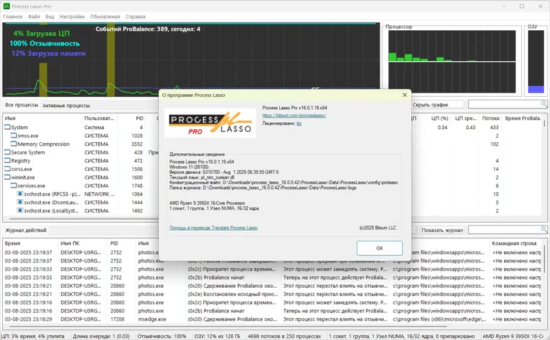 Process Lasso — это профессиональный инструмент, предназначенный для управления ресурсами компьютера. Он способен автоматически перераспределять приоритеты запущенных процессов, чтобы обеспечить максимальную производительность и минимальные задержки. Программа совместима с 32-битными и 64-битными системами и включает множество функций для настройки работы системы под индивидуальные потребности пользователя. Ее можно скачать с официального сайта, что позволяет легко получить доступ к последним обновлениям и активировать программу с помощью ключа или официального кода.