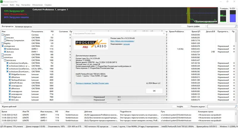 Process Lasso — мощная системная утилита, которая позволяет управлять процессами на компьютере для повышения скорости и стабильности работы системы. Программа автоматически или вручную регулирует приоритеты запущенных приложений, предотвращая зависания и замедление работы из-за чрезмерной загрузки центрального процессора. Благодаря технологиям типа ProBalance, она обеспечивает оптимальное распределение ресурсов и улучшает отклик системы, что особенно важно при выполнении ресурсоемких задач.