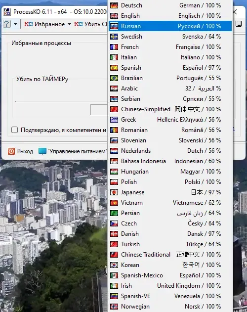 Для использования ProcessKO необходимо просто запустить программу, выбрав нужный язык интерфейса при первом запуске. После открытия окна программы на экране появится список всех активных процессов, среди которых можно выбрать нужный для завершения. Для этого достаточно отметить соответствующий процесс и нажать кнопку завершения. Встроенная система позволяет быстро закрывать процессы без дополнительных настроек или сложных команд. Для удобства можно закрепить программу в трей, чтобы она всегда была под рукой. В случае зависших приложений, которые не закрываются стандартным способом, ProcessKO станет отличным решением для быстрого их устранения.