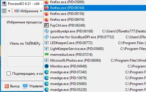 Для использования ProcessKO достаточно запустить программу, выбрав нужный язык интерфейса при первом запуске. После открытия окна программы перед вами появится список всех активных процессов, где можно легко выбрать любой из них и мгновенно завершить его одним кликом. В трей-меню отображаются все текущие процессы, что позволяет быстро реагировать на зависшие или ненужные задачи. В случае необходимости, программа работает полностью портативно, не требует инсталляции и может быть запущена с флешки или другого носителя.