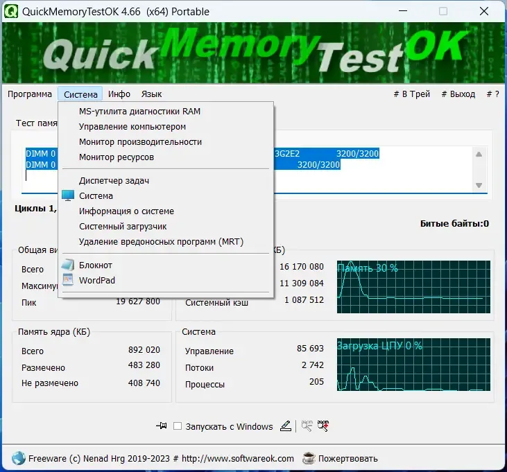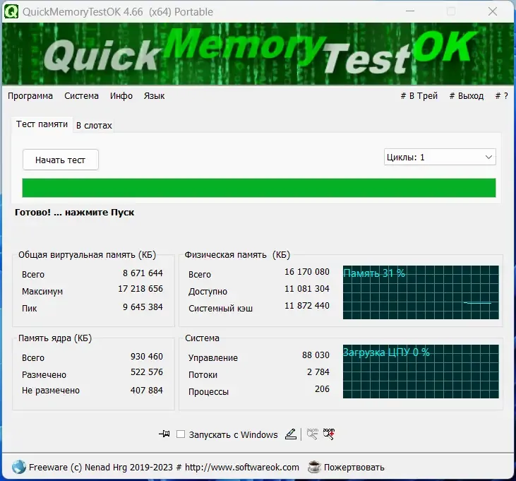 QuickMemoryTestOK представляет собой компактную утилиту, которая позволяет быстро и точно выполнить тестирование оперативной памяти на наличие ошибок. Программа отличается высокой скоростью работы и возможностью настройки тестовых параметров, что делает её удобной для использования в различных ситуациях. Помимо этого, она способствует изучению поведения ПК при больших нагрузках, помогая определить, является ли память причиной системных сбоев или ошибок.