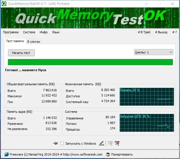 QuickMemoryTestOK — это легкая и переносная утилита, которая позволяет выполнять быстрые тесты оперативной памяти без необходимости сложной настройки. Она подходит как для профессиональных специалистов, так и для обычных пользователей, желающих самостоятельно проверить состояние своего ПК. Программа обладает рядом уникальных особенностей, таких как возможность ставить тестирование на паузу или запускать индивидуальные тестовые сценарии, что делает ее универсальным инструментом для диагностики системных ошибок и анализа поведения системы при больших нагрузках.