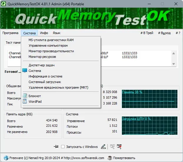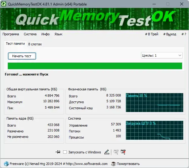 QuickMemoryTestOK — это портативная утилита, которая отличается небольшим размером и низким потреблением ресурсов системы. Она позволяет выполнять быстрые и настраиваемые тесты памяти, а также мониторить работу ПК при повышенной нагрузке. Благодаря возможности поставить тестирование на паузу, пользователь может наблюдать за поведением системы в реальном времени, что делает программу незаменимым инструментом для системных администраторов и продвинутых пользователей. Утилита также предоставляет основные характеристики системы и памяти, что помогает в диагностике и профилактике ошибок.
