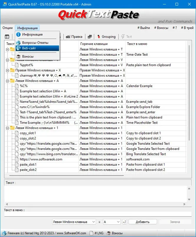 QuickTextPaste — это легкая и портативная утилита, которая позволяет сохранять часто используемые тексты и быстро вставлять их в нужные поля с помощью горячих клавиш. После запуска программы пользователь вводит необходимый текст в выделенное окно, прикрепляет его к выбранной горячей клавише и в дальнейшем просто нажимает эту комбинацию для вставки. Это значительно упрощает работу с шаблонами, комментариями, адресами и другими повторяющимися текстами. Программа не требует установки, что делает её максимально удобной для использования на любом компьютере.